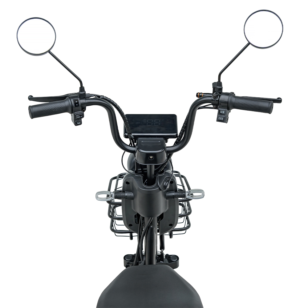 Панель приладів являє собою мінікомп’ютер, розташований на кермі. Чіткий LCD-дисплей показує всі необхідні параметри: швидкість у реальному часі, відсоток заряду, щоб не здивуватися на півдорозі, обраний режим їзди, пробіг (одометр) і навіть індикатори поворотів чи дальнього світла. Панель яскрава, з підсвічуванням, читається добре, як у темряві, так і у світлий день.