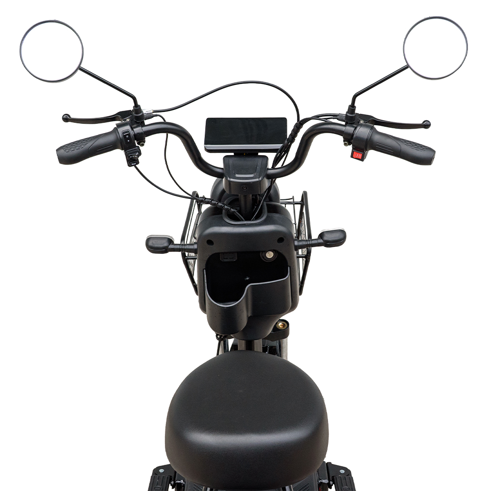 Дзеркала на кермі дозволяють бачити все позаду без повороту голови, що є запорукою впевненого кермування. Вони регулюються, не тремтять на швидкості і підвищують безпеку в трафіку. В місті це рятує від несподіванок, таких як машини, велосипедисти чи пішоходи. З дзеркалами ви їдете впевнено, як на скутері, але екологічніше і дешевше.