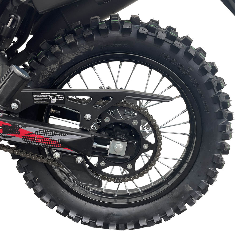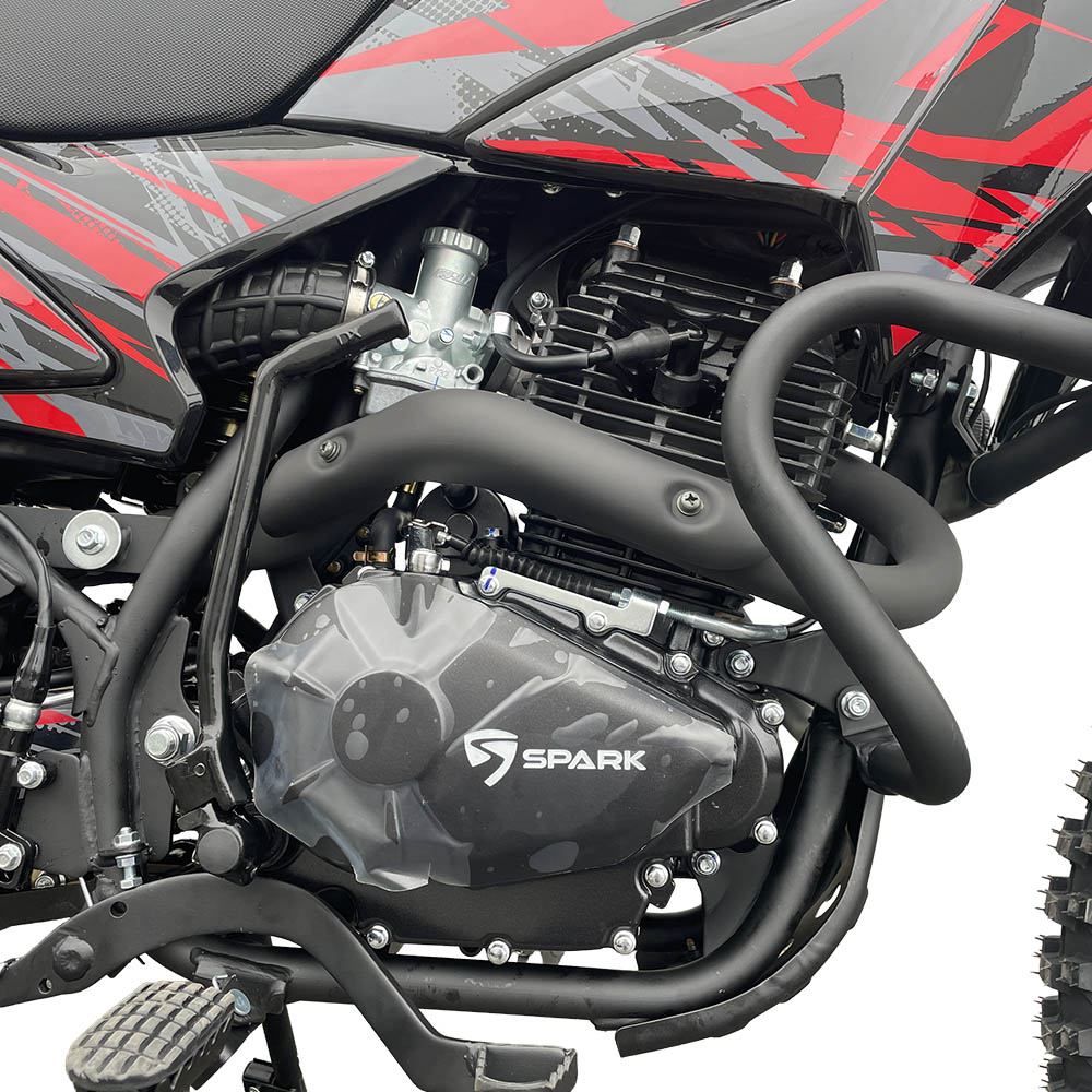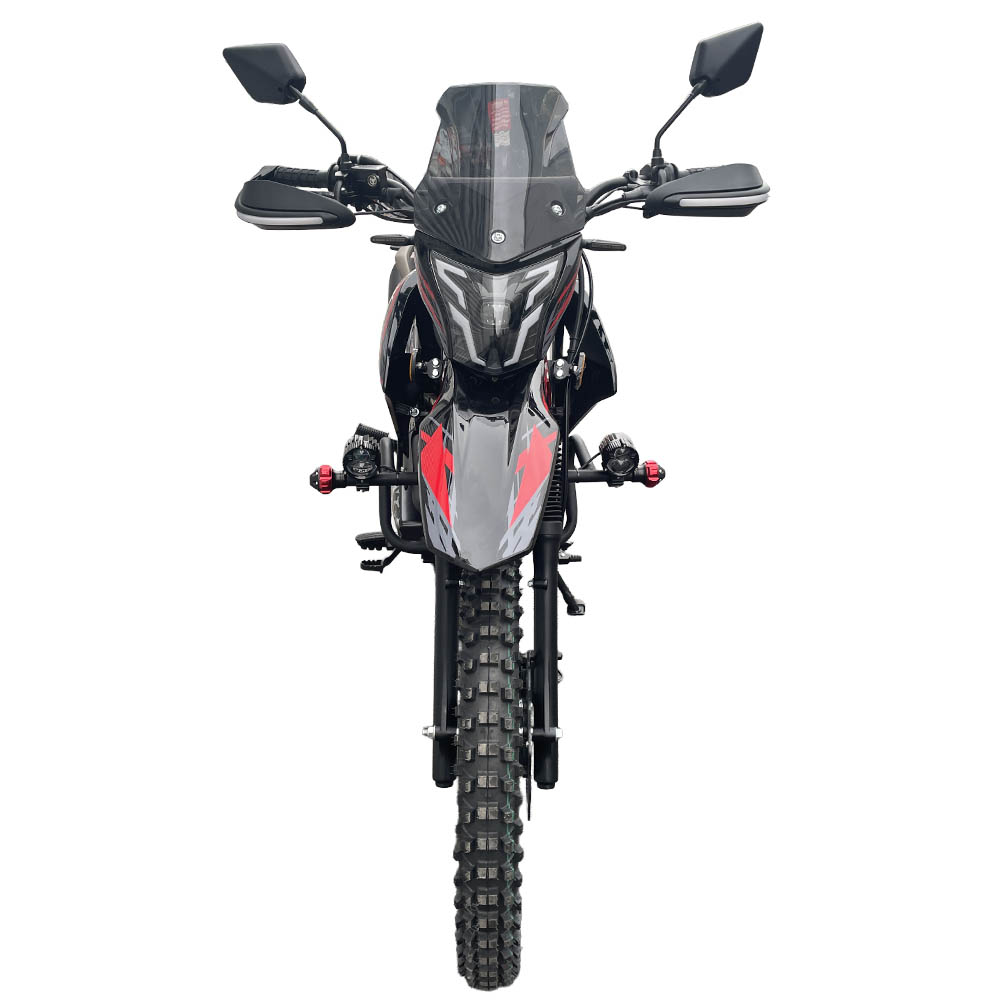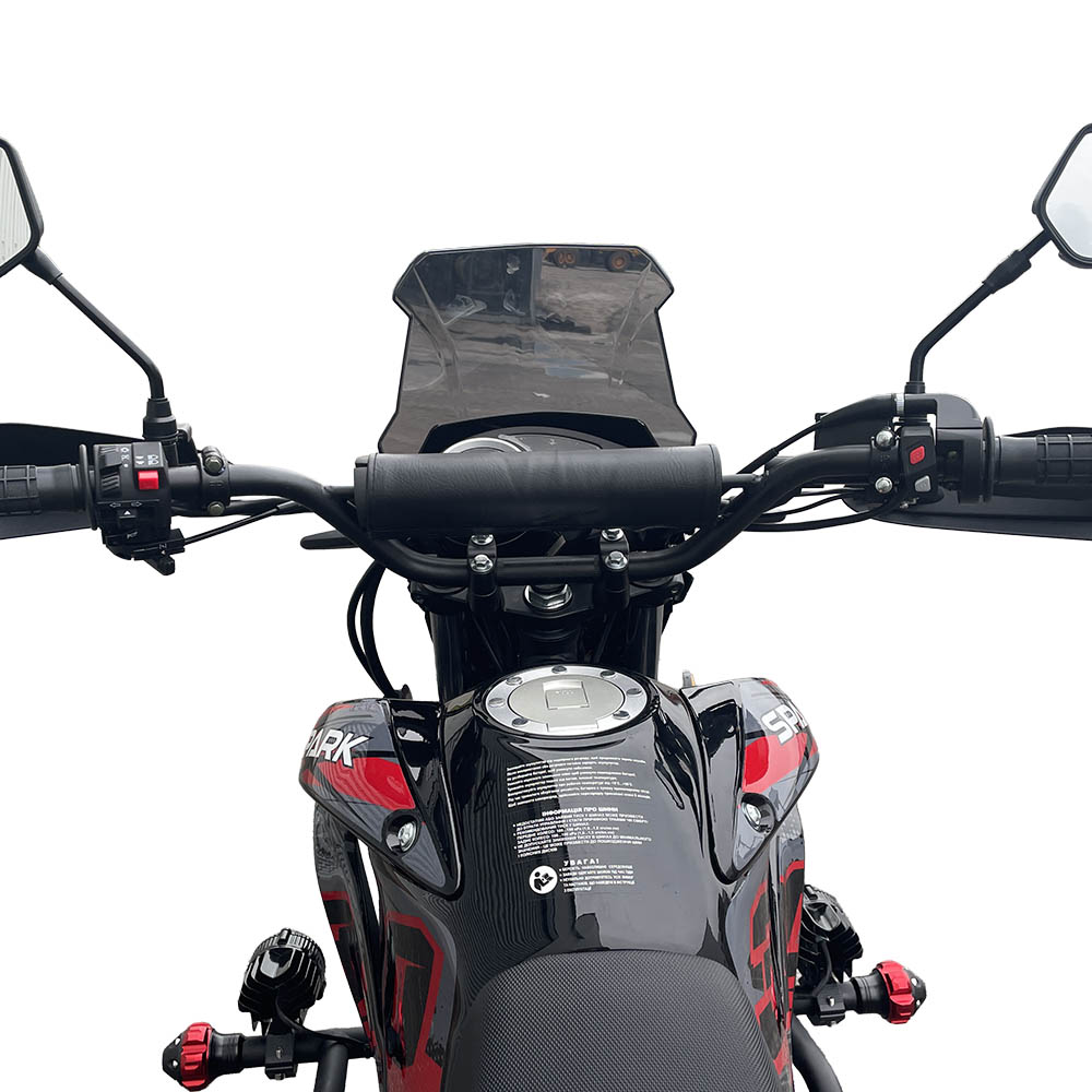 Заводський захист двигуна закриває нижню частину силового агрегата від ударів камінням, ґрунтом і перешкодами на бездоріжжі. Це практичне рішення для тих, хто планує активно використовувати мотоцикл поза асфальтом.