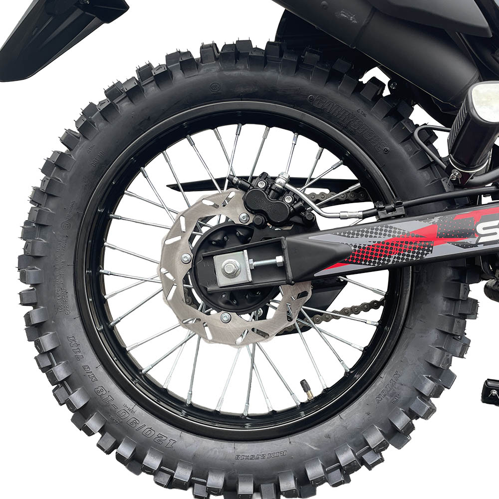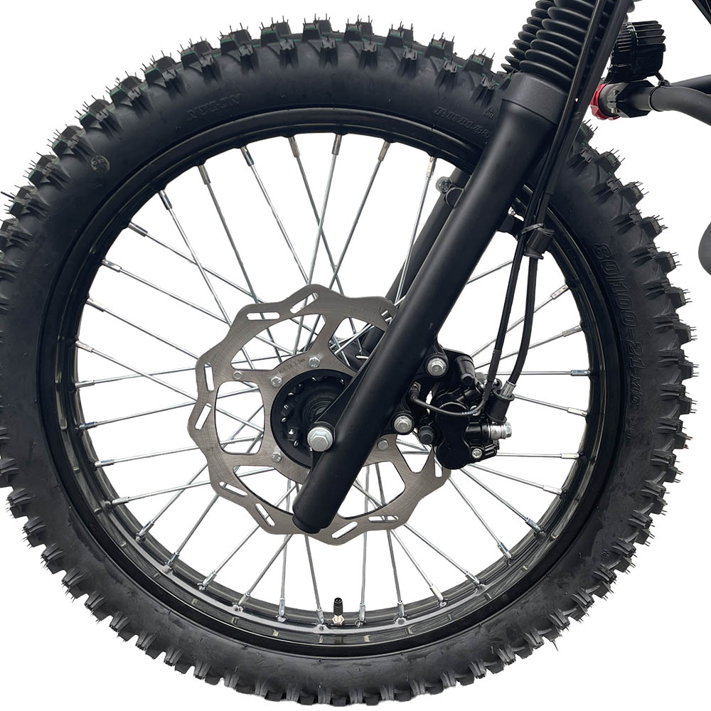 Дуплексна трубчаста рама формує міцну й витривалу основу конструкції. Передня телескопічна вилка та задня маятникова підвіска з моноамортизатором добре відпрацьовують нерівності. Спицьовані сталеві колеса комплектуються позашляховими високопрофільними шинами 80/100-21 спереду та 120/90-18 ззаду. Гідравлічні дискові гальма на обох колесах забезпечують стабільне й прогнозоване гальмування.