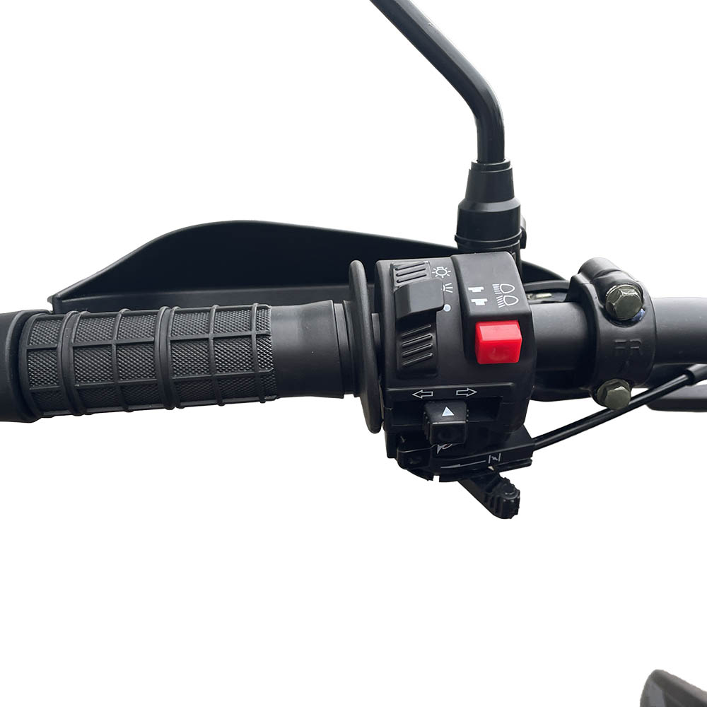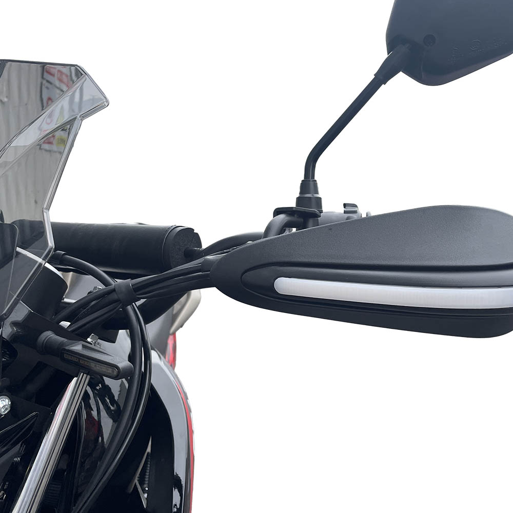 Захист рук виконує одразу дві функції: захищає кисті від гілок, каміння та зустрічного потоку повітря, а також інтегрує світлодіодні динамічні покажчики поворотів. Таке рішення додає практичності та підвищує безпеку руху.