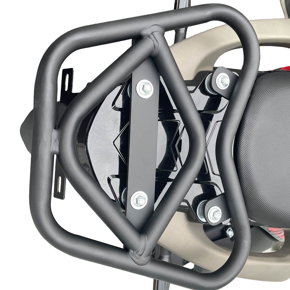 Задній багажник входить до стандартного оснащення та дозволяє перевозити додатковий вантаж або встановити кофр (за потреби). Він підвищує функціональність мотоцикла у повсякденному використанні та під час далеких поїздок.