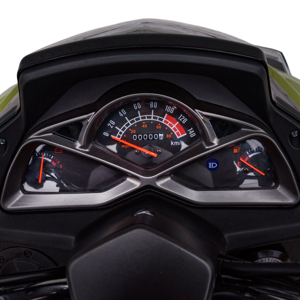 Приладова панель Комбінована, вбудована в обтічник. Механічний спідометр, одометр, тахометр, індикація: рівень палива, дальнє світло, повороти.