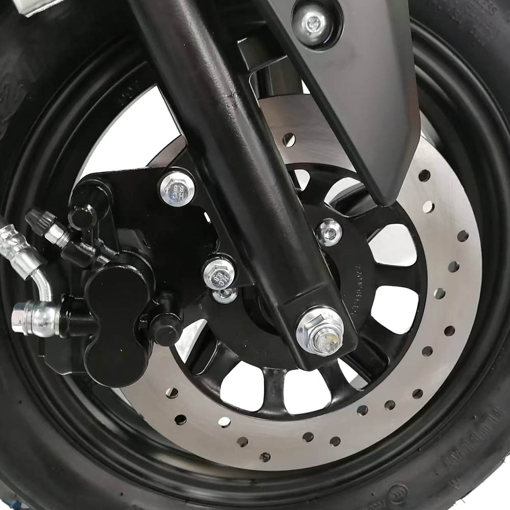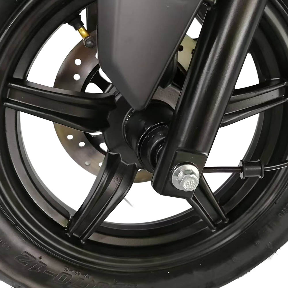 Телескопічна передня вилка і задня маятникова підвіска з двома пружинними амортизаторами ефективно згладжують нерівності міських доріг. Гідравлічні дискові гальма спереду і ззаду забезпечують впевнене та прогнозоване уповільнення. Легкосплавні литі колеса з дорожнім шосейним протектором розміром 120/70-12 спереду і ззаду оптимально підходять саме для асфальту і міського режиму.