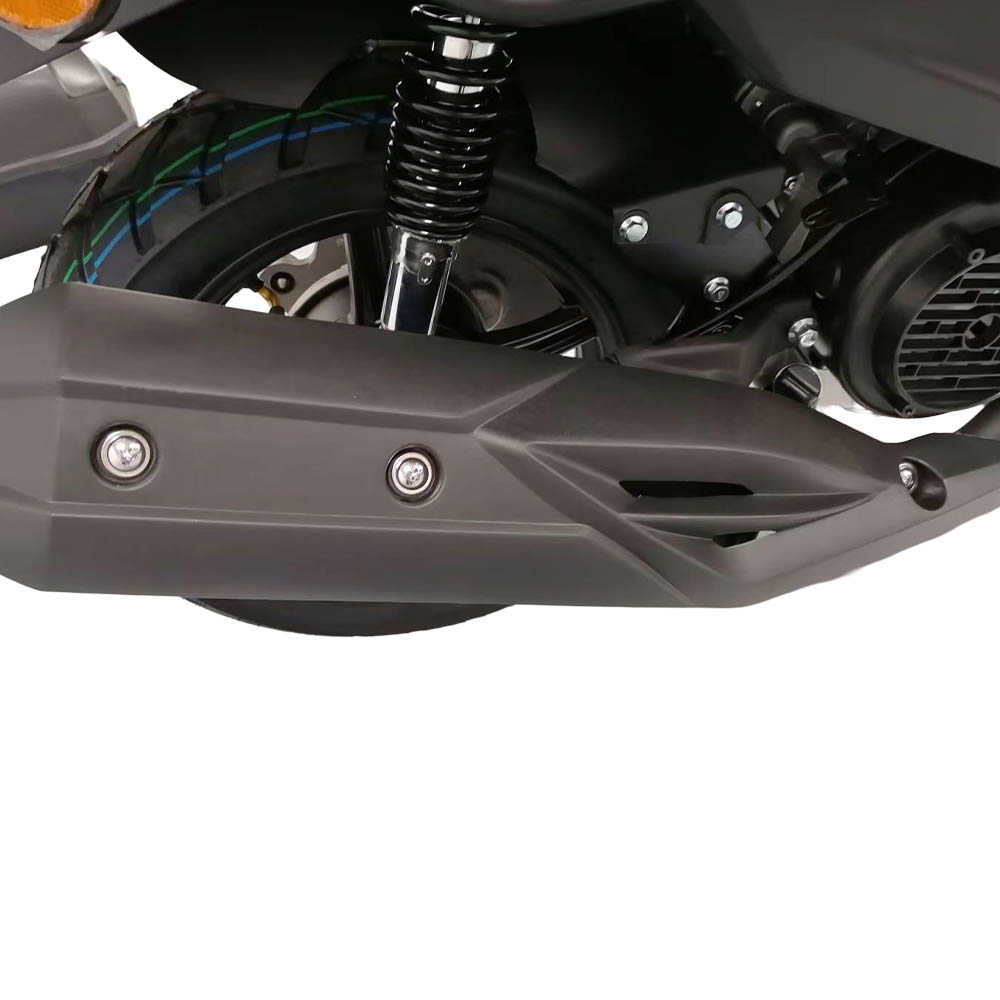 В основі моторолера — перевірений одноциліндровий чотиритактний карбюраторний двигун 1P57QMJ потужністю 8,6 к.с. Він розрахований на стабільну, спокійну роботу і не потребує складного обслуговування. Примусове повітряне охолодження добре справляється з міськими навантаженнями, а безступінчастий клиноремінний варіатор у парі з автоматичним відцентровим зчепленням робить керування максимально простим і зрозумілим. Запуск можливий як електростартером, так і кікстартером, що підвищує надійність у повсякденних умовах.
