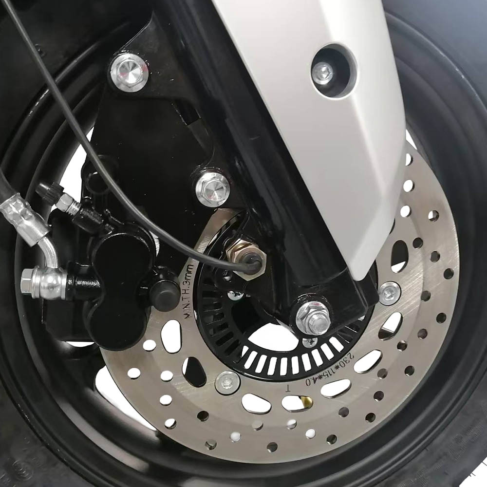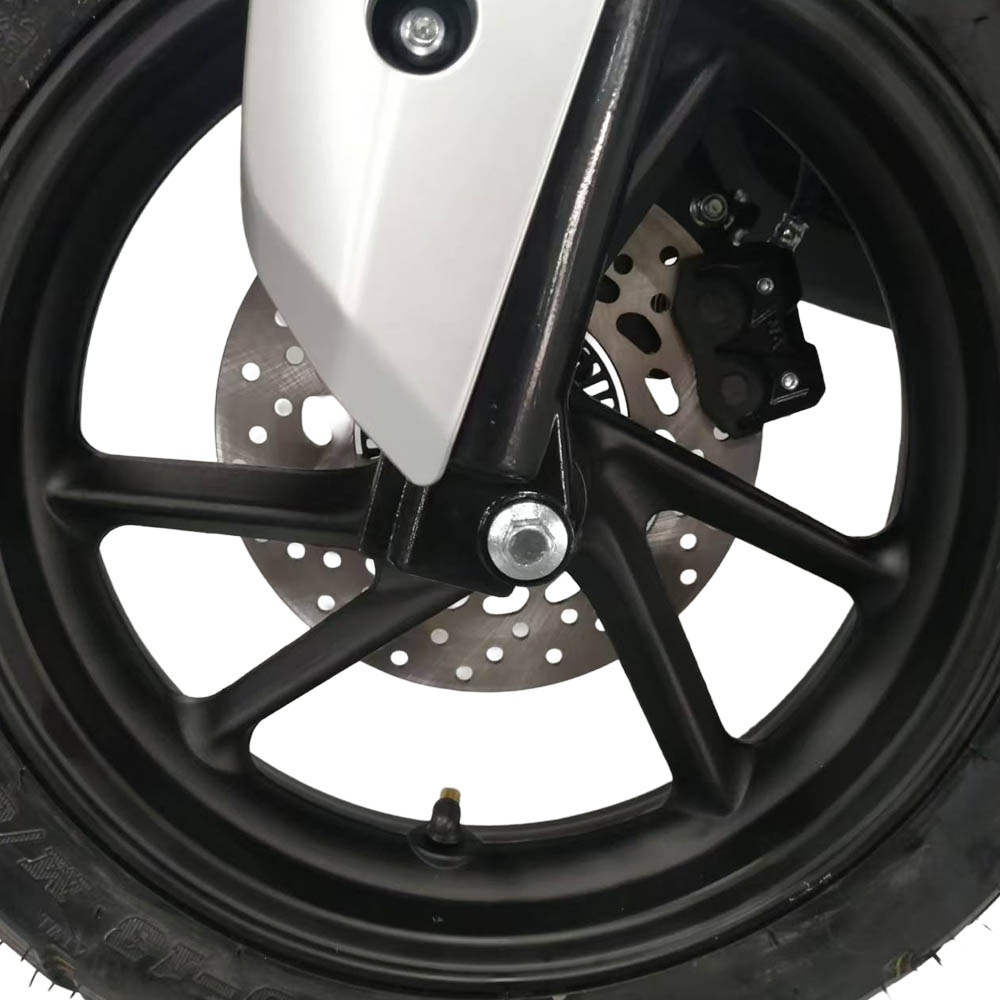 Дискові гальма спереду та ззаду гарантують ефективне гальмування, а дорожній шосейний протектор шин 130/60-13 забезпечує надійне зчеплення з асфальтом. Габарити скутера: 1950×750×1231 мм, що робить його компактним для міського паркування та зберігання.