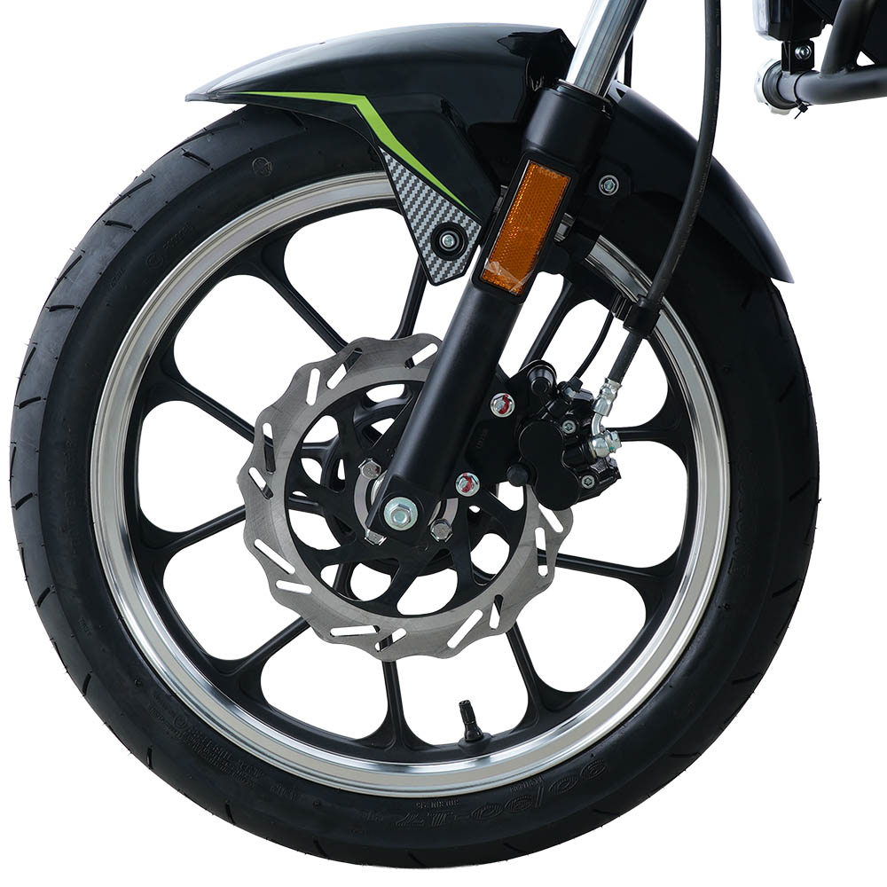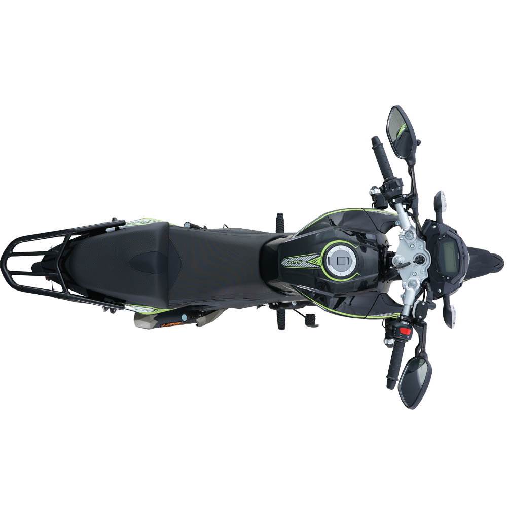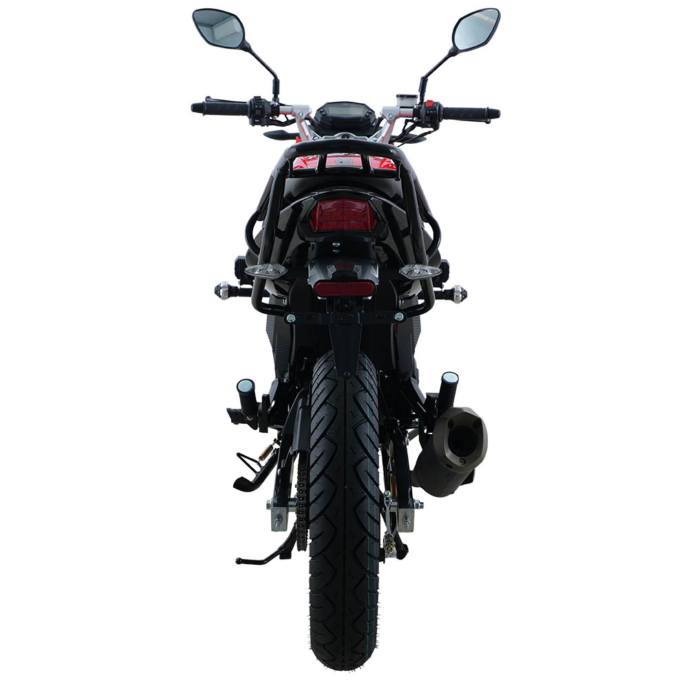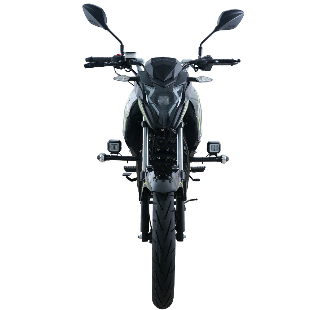 Мотоцикл двомісний, розрахований на навантаження до 150 кг, із висотою сидіння 800 мм – зручною для впевненої посадки та стабільного контролю на малій і середній швидкості. Електронна панель приладів, світлодіодна оптика, електростартер і кікстартер, а також дискове переднє гальмо формують практичний і збалансований образ сучасного дорожнього байка. Колісна база 1365 мм забезпечує поєднання стійкості на прямій дорозі та передбачуваної керованості в поворотах, що особливо важливо в міському трафіку.