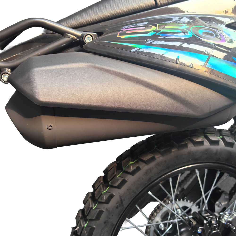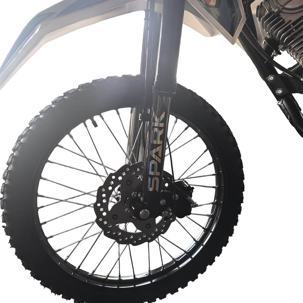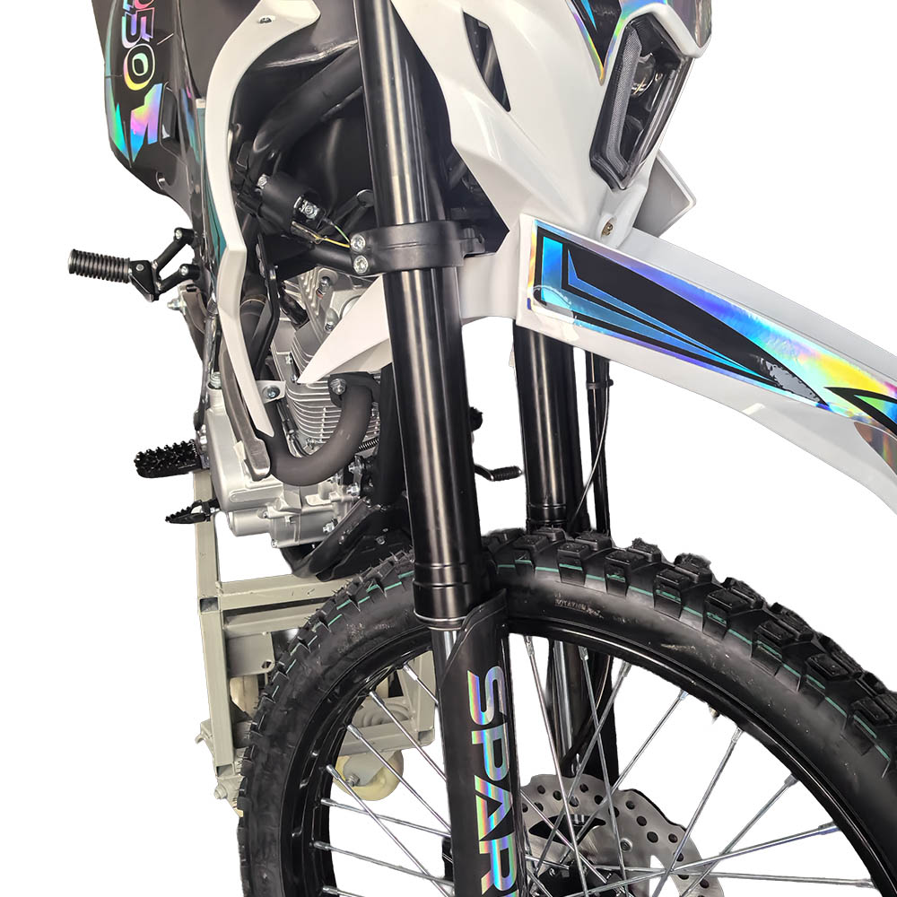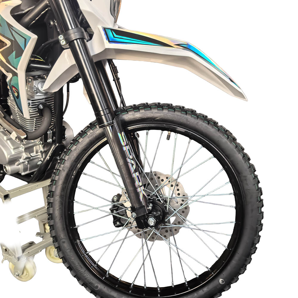 Обидва гальма дискові гідравлічні, що гарантує стабільне та точне сповільнення навіть під час активної їзди. Позашляхові шини 80/100-21 спереду та 120/90-18 ззаду з високопрофільним протектором забезпечують надійне зчеплення на ґрунтових дорогах, піску, мокрих поверхнях або кам’янистих ділянках. Габарити 2060×835×1370 мм формують оптимальний баланс між компактністю та стійкістю.