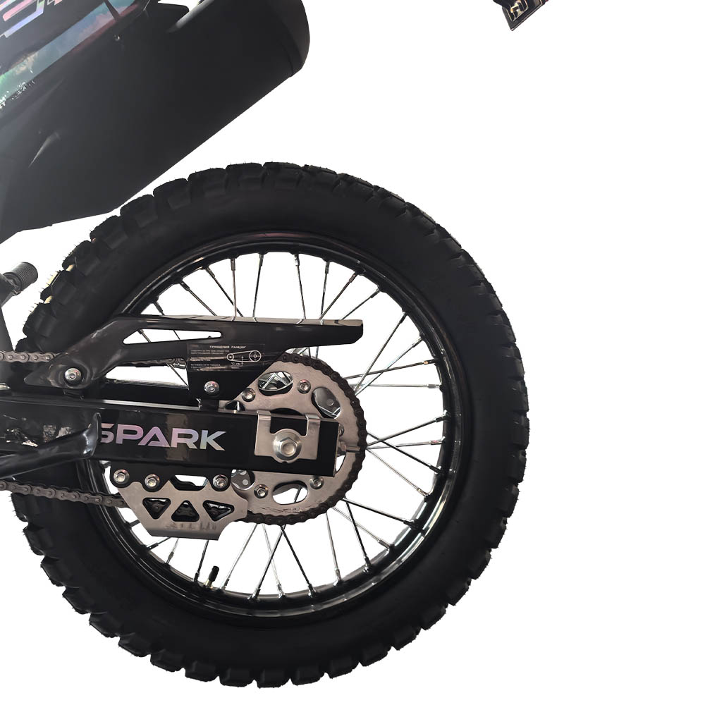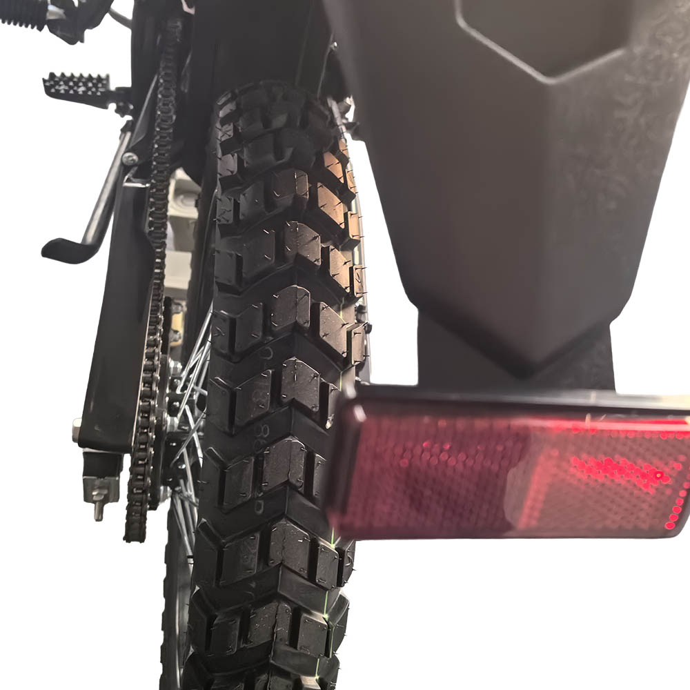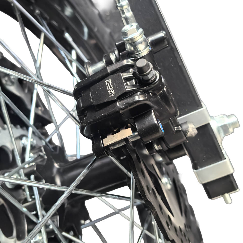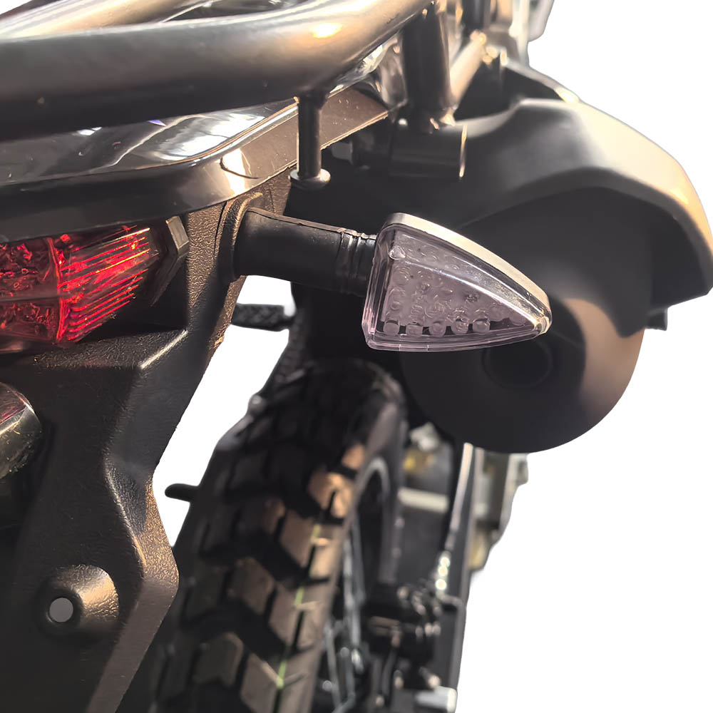 Обидва гальма дискові гідравлічні, що гарантує стабільне та точне сповільнення навіть під час активної їзди. Позашляхові шини 80/100-21 спереду та 120/90-18 ззаду з високопрофільним протектором забезпечують надійне зчеплення на ґрунтових дорогах, піску, мокрих поверхнях або кам’янистих ділянках. Габарити 2060×835×1370 мм формують оптимальний баланс між компактністю та стійкістю.