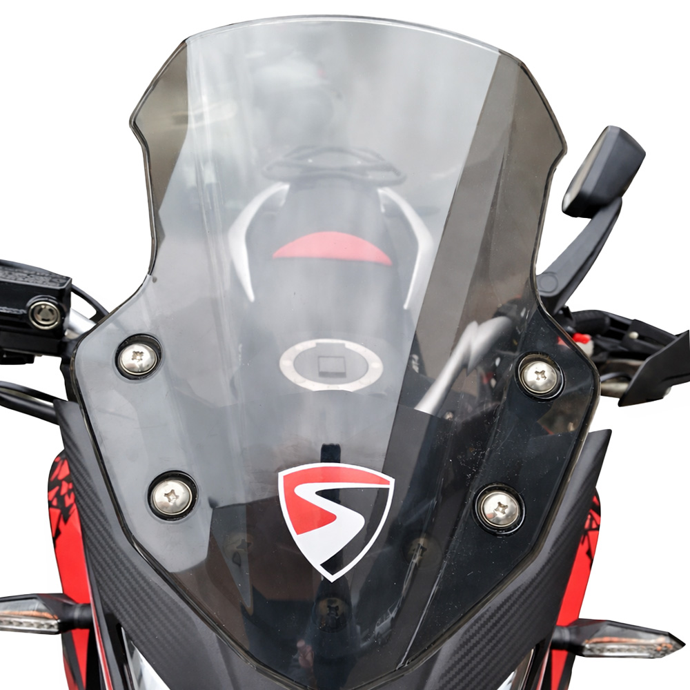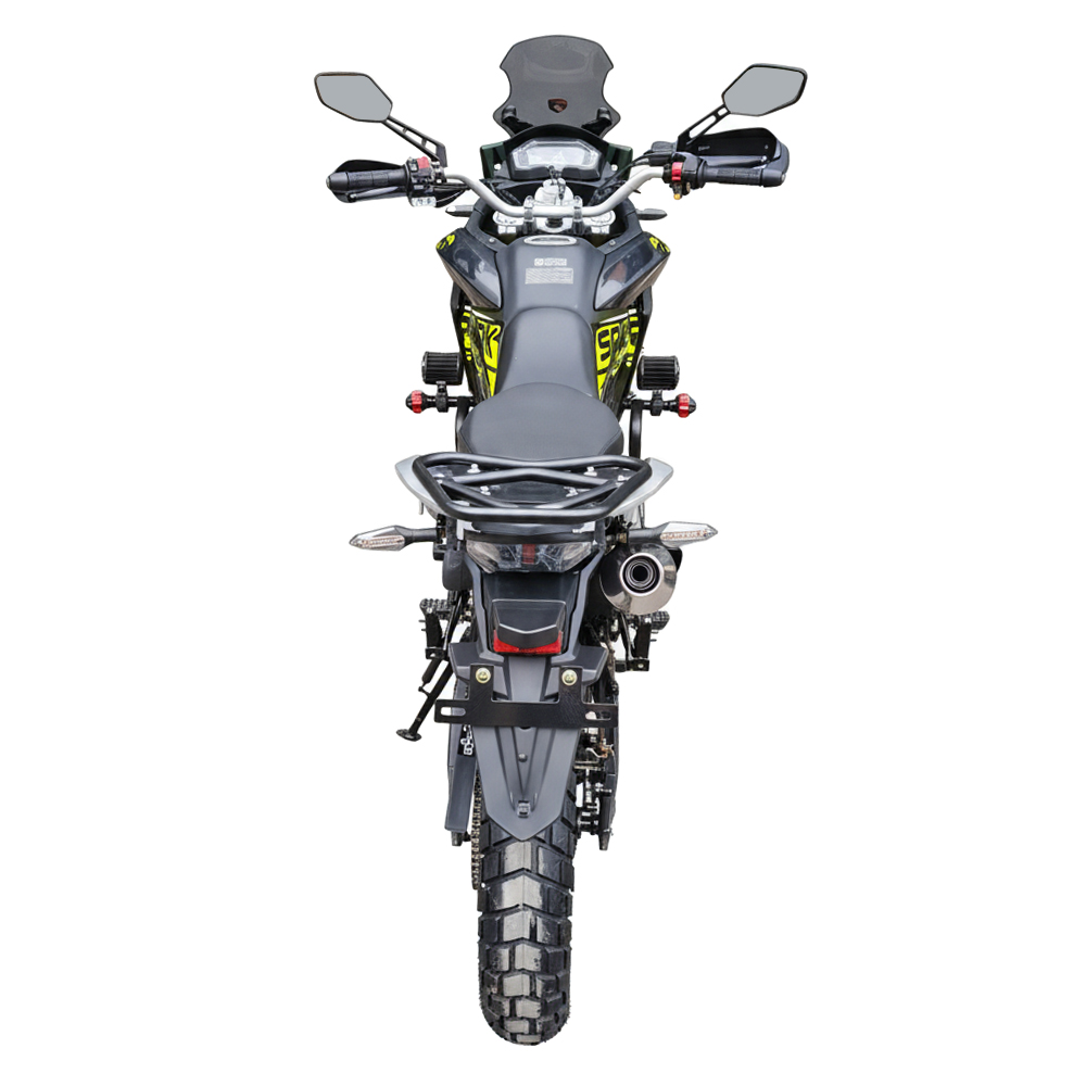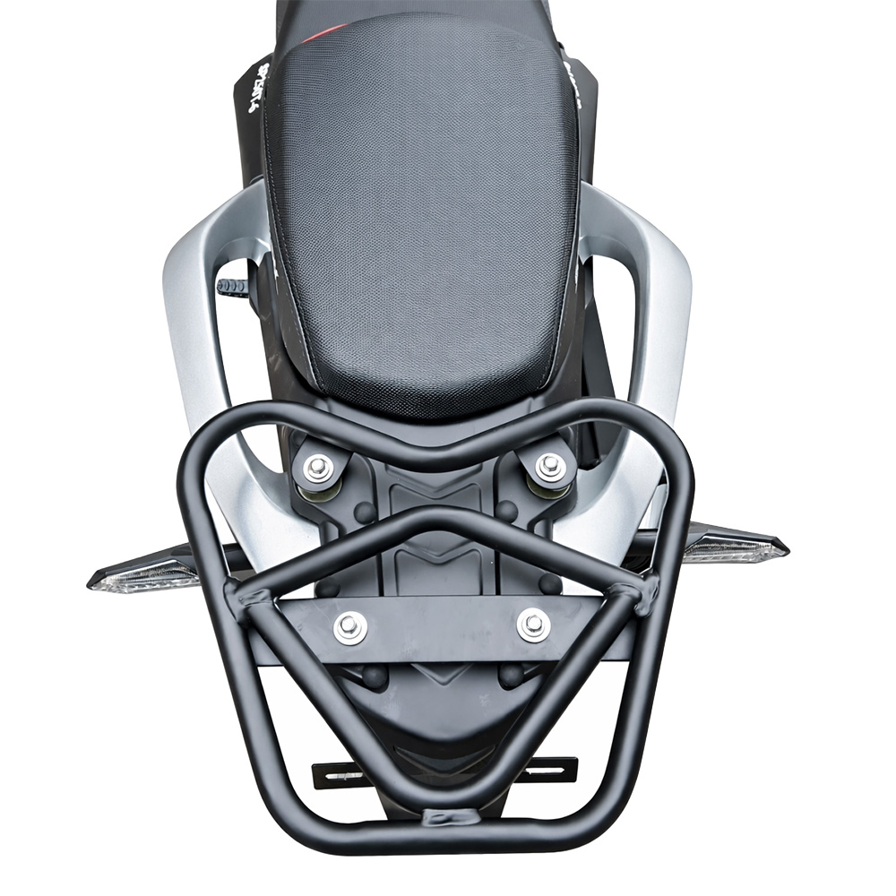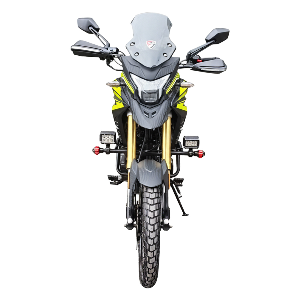 Передня та задня світлодіодна оптика з динамічними покажчиками поворотів забезпечує добру видимість і підвищує безпеку. Оновлене, більш ЗАТЕМНЕНЕ ЛОБОВЕ СКЛО ефективніше захищає від зустрічного потоку повітря, не створюючи візуального дискомфорту. Спортивне дворівневе сидіння напівжорсткого типу розраховане на тривалі поїздки, а відкидні алюмінієві підніжки водія та пасажира доповнюють загальну ергономіку. Захист рук із LED-підсвіткою, дуги безпеки, задній багажник і додаткове освітлення на бампері підкреслюють практичну спрямованість моделі.