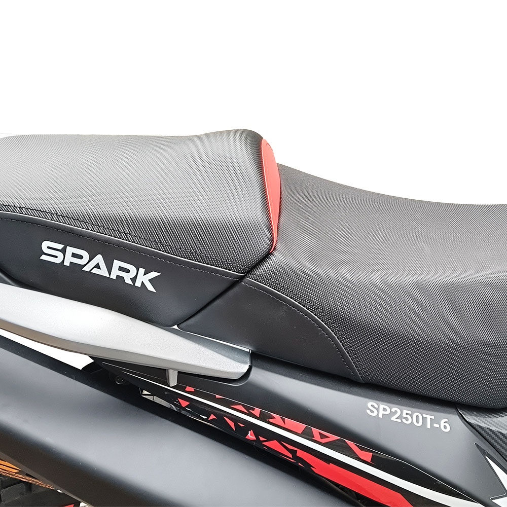 Двигун робочим об’ємом 229,5 см³ дозволяє розвивати швидкість до 110 км/год, забезпечуючи стабільну тягу в усьому робочому діапазоні. Двомісна компоновка, вантажопідйомність до 150 кг і конструкційна маса 138 кг формують відчуття зібраності та прогнозованої керованості. Паливний бак на 14 літрів у поєднанні з витратою близько 2,3 л/100 км робить SP250T-6 економним супутником для далеких поїздок. Висота по сидінню 890 мм і колісна база 1390 мм забезпечують зручну посадку та впевненість на швидкісних ділянках і в поворотах.