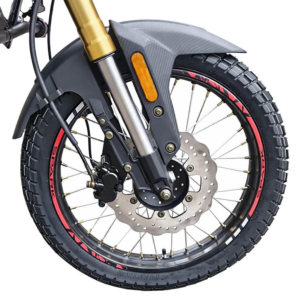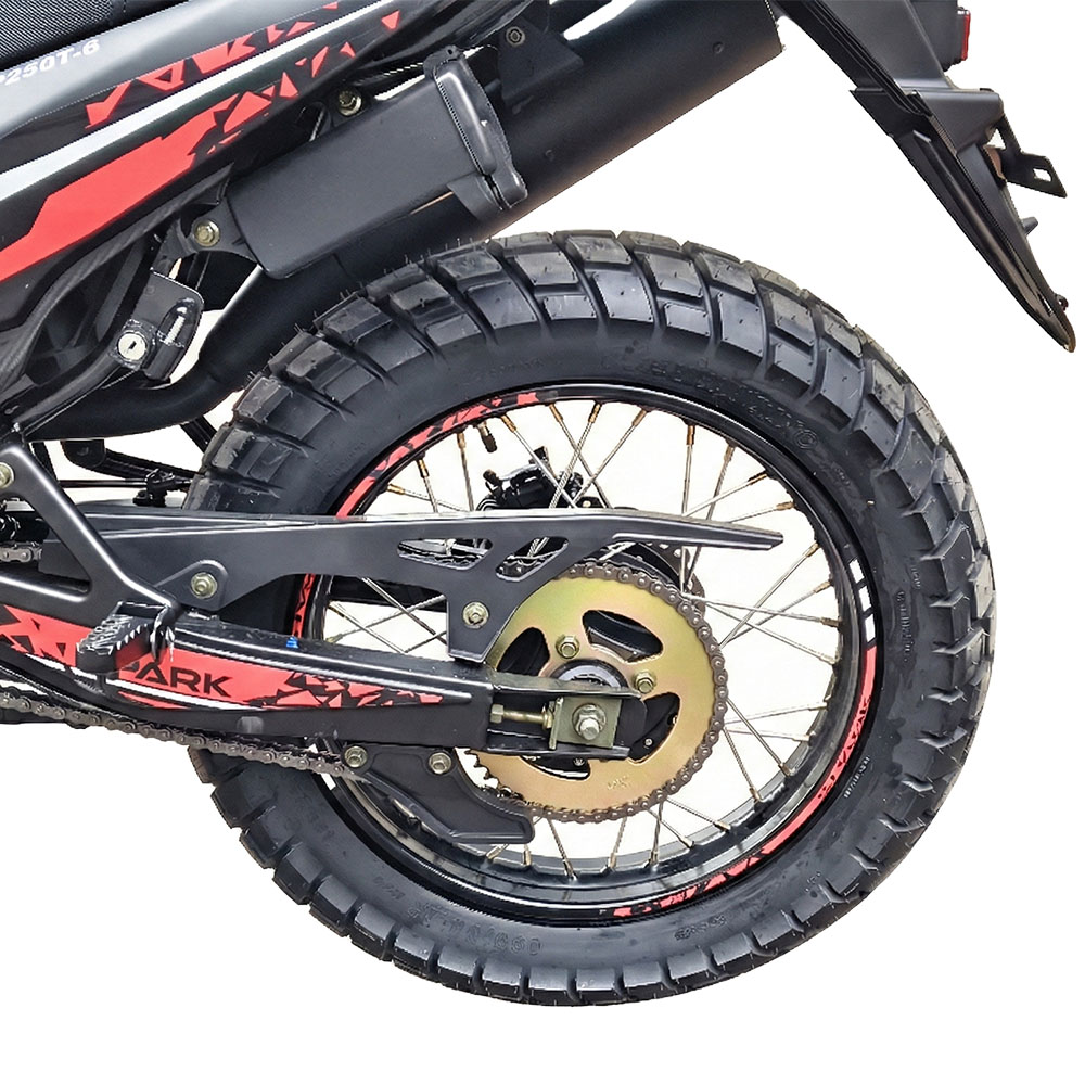 Металевий каркас рами розрахований на комбіновані навантаження асфальту й ґрунту. Спицеві колеса з шинами 80/100-19 спереду та 130/80-17 ззаду з універсальним протектором добре працюють як на твердому покритті, так і на легкому бездоріжжі. Перевернута телескопічна вилка спереду та маятникова задня підвіска з моноамортизатором забезпечують стабільність і комфорт. Гідравлічні дискові гальма з обох боків із рідиною DOT-3 відповідають за впевнене та прогнозоване гальмування.