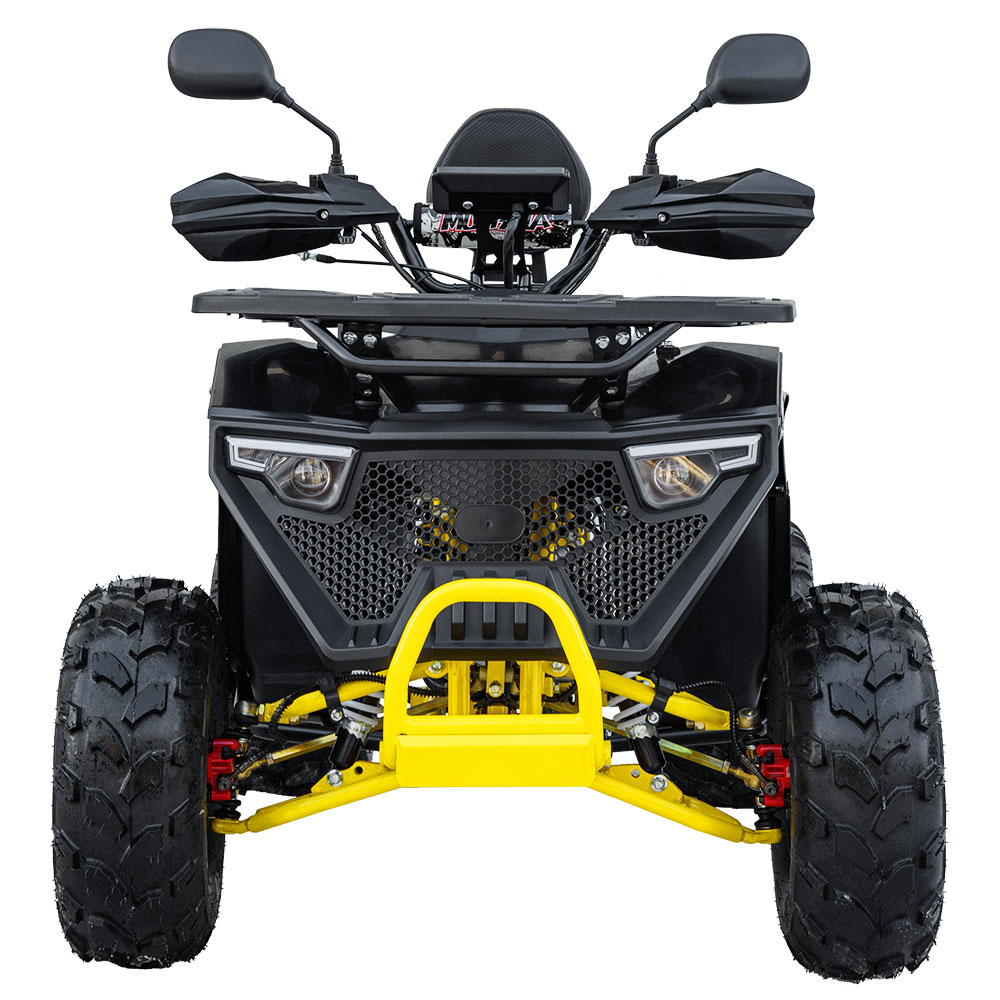 Передние фары со светодиодными лампами обеспечивают яркое и равномерное освещение дороги. LED-технология гарантирует энергоэффективность и долговечность, позволяя уверенно ездить в тёмное время суток или в условиях тумана. Габаритные огни и указатели поворотов также светодиодные, что повышает видимость квадроцикла для других участников движения.