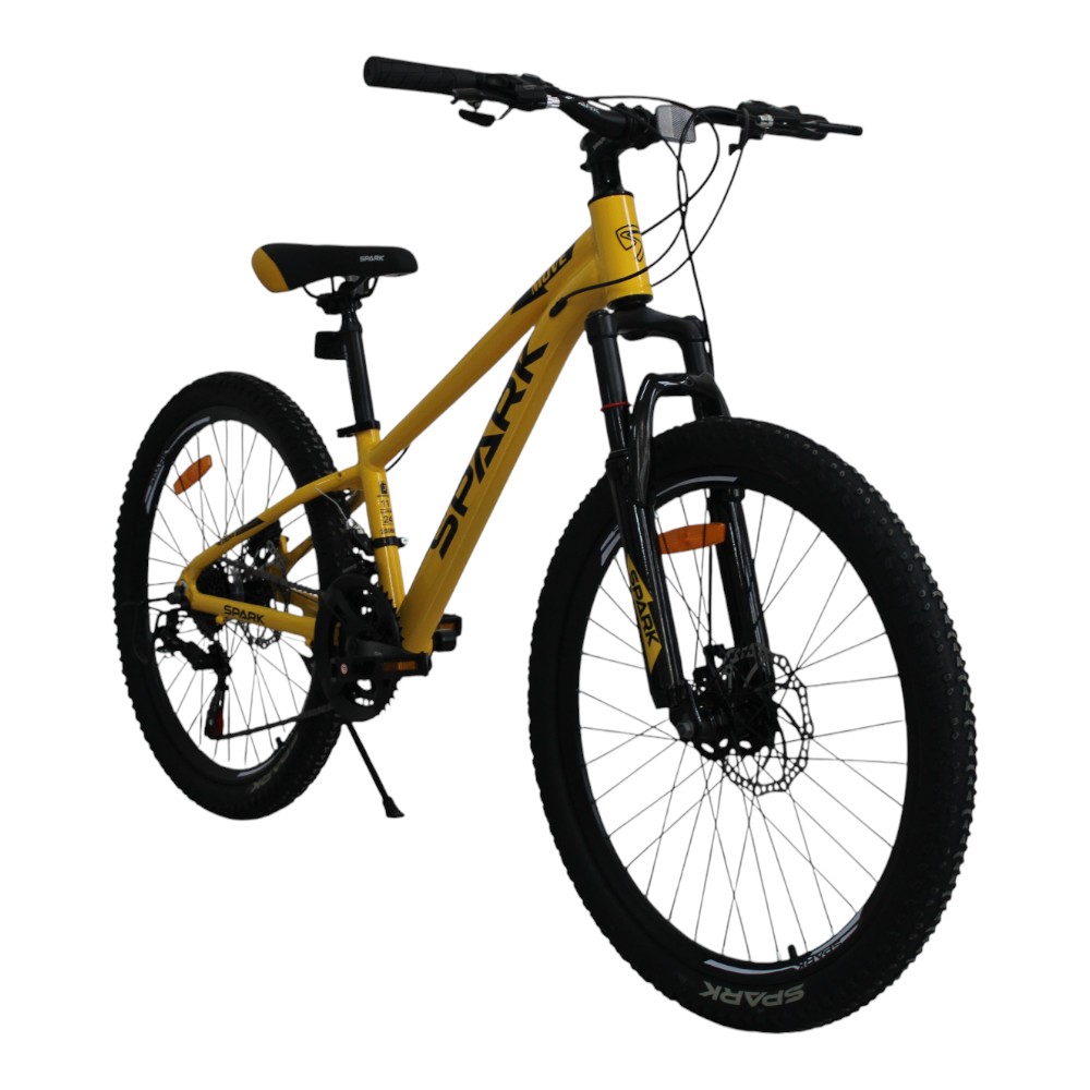 Двостінні алюмінієві ободи 14G*36H добре тримають форму та витримують активне використання. Покришки SPARK 24×2,125 забезпечують надійне зчеплення з покриттям і впевненість у поворотах, а бутилові камери розраховані на щоденну експлуатацію без зайвих турбот. Сталеві втулки мають хороший ресурс, а захист заднього перемикача допомагає вберегти трансмісію від випадкових ударів і падінь.